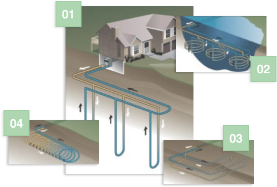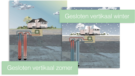 De meest betrouwbare en energiezuinige wijze van warmte uitwisseling met warmtepompen is een gesloten bodem installatie. Bij een dergelijke installatie wordt een systeem met gesloten collectoren toegepast. Dit kunnen horizontale of vertikale systemen zijn. Vanwege het geringer benodigd terreinoppervlak wordt in Nederland veelal gekozen voor vertikale systemen, zie afbeeldingen: